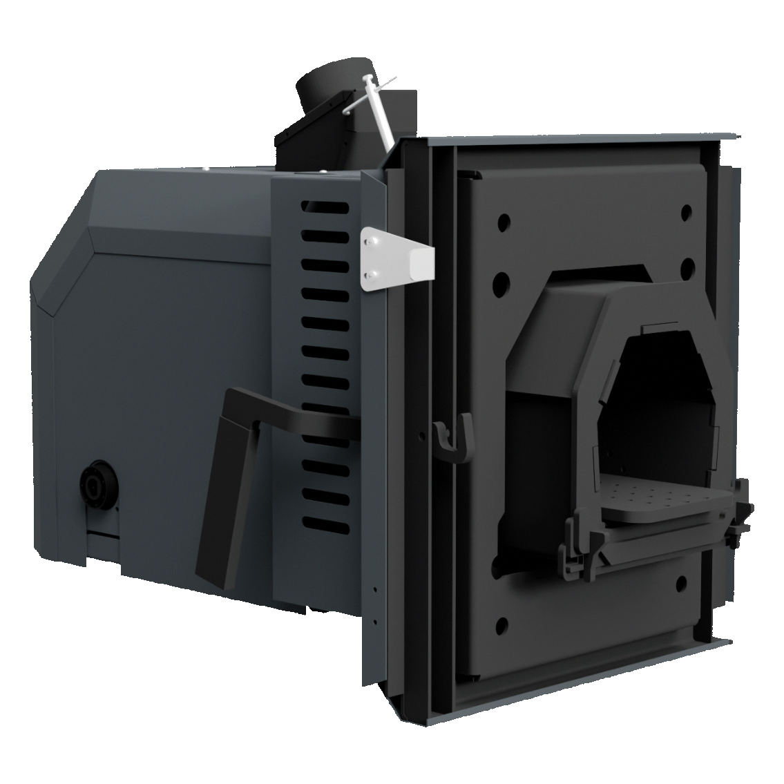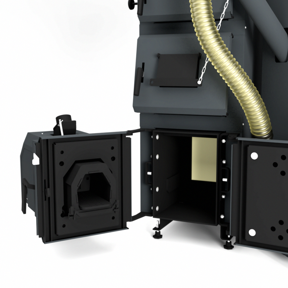 Na kotli jsou umístěna dvířka proti sobě. Na jedné straně je namontován peletový hořák, zatímco druhá strana je vybavena klasickými přikládacími dvířky pro spalování dřeva. Jednoduchým uzavřením dvířek, která nejsou v daném režimu potřeba, lze kotel snadno přizpůsobit zvolenému způsobu vytápění bez složitých zásahů.